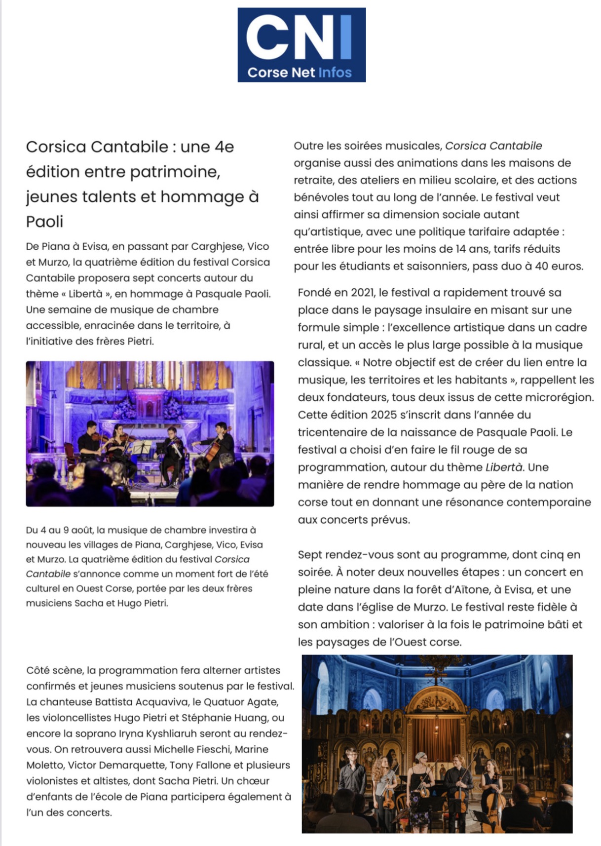 Festival de musique de chambre 4e édition Piana, Carghjese, Vico, Evisa et Murzo
